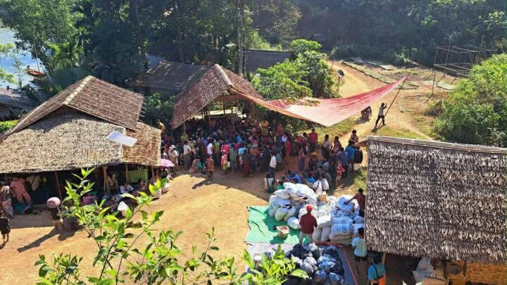 民間の援助団体が国内避難民に食料を配っているところ。彼らは、ミャンマー南部のタニンダーリ管区で起きた紛争から逃れてきた