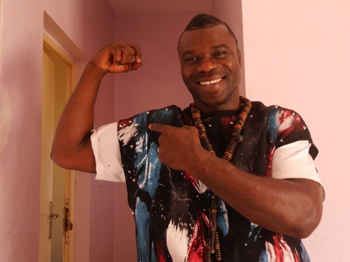 鍛え抜かれたアルバルカ・カエレ選手の肉体。スクワットで200キログラムのウエイトを上げられるという。本人はダカールの下町バラカ生まれだが、両親はセネガルの南に位置するギニア共和国からの移民引退後は靴屋を開きたい