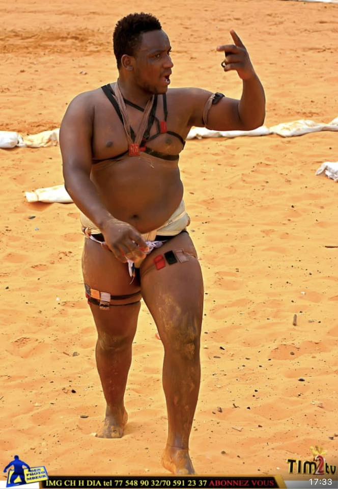 ダカール市内の競技場でまわし(ゲンブ)を締め、鍛え上げた体を見せるジュニオール賞金19万円、生活はタクシーで支える